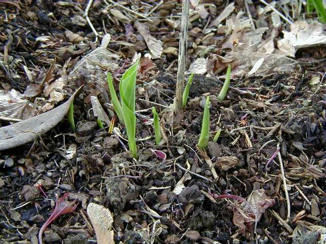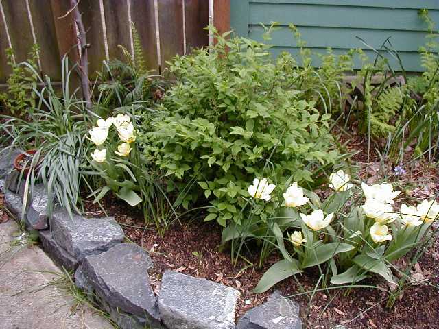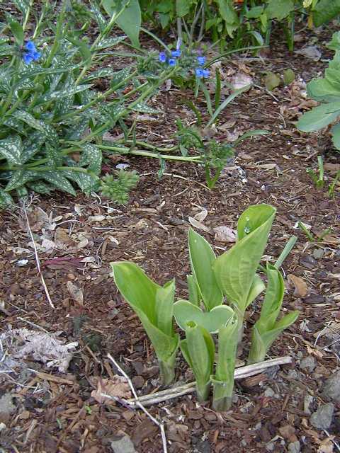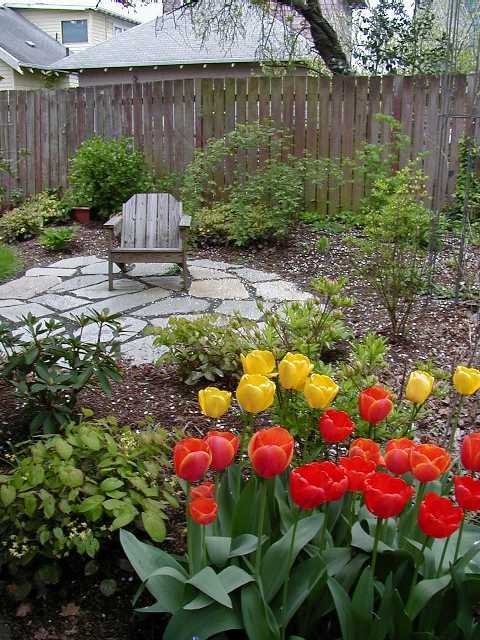 I mowed the lawn twice already. Those are Red Riding Hood tulips lining the path, and blue forget-me-nots, and